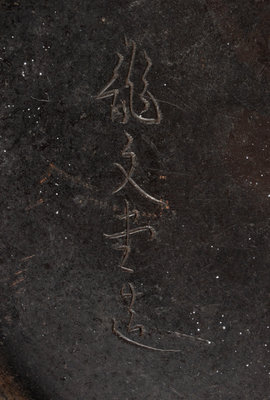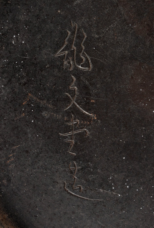 cast in iron, of tapering globular form, the exterior cast in shallow relief showing tall grass, signed Ryubundo zo.