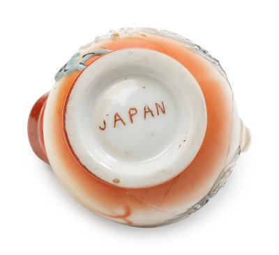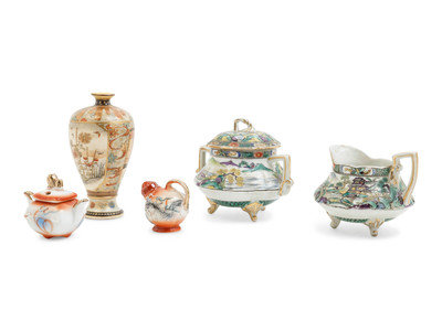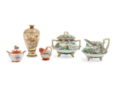 comprising two polychrome enameled sugar bowls, a polychrome enameled creamer, a polychrome enameled teapot and a satsuma vase.