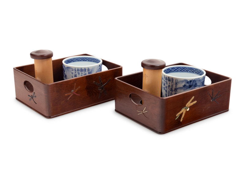 decorated with horn, bone, hardwood and mother-of-pearl inlaid dragonflies, each with a porcelain bowl, bamboo pot with a cover and stand, together with the original storage box.