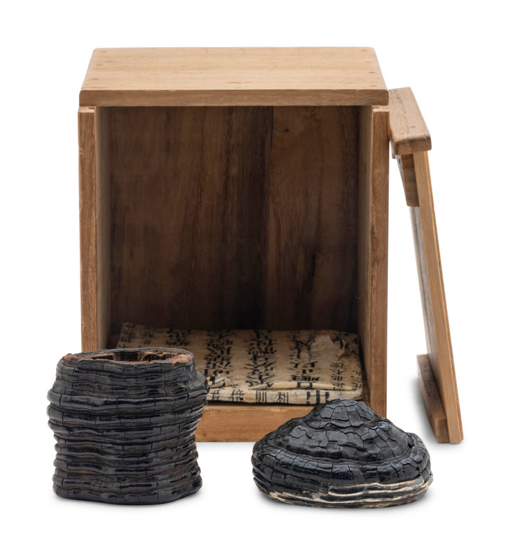 in the form of reishi fungus with silver rim.