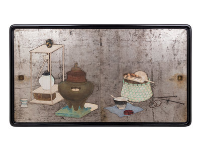 originally a shoji (sliding door for cabinets), painted to show tea wares against a silvered background, signed.