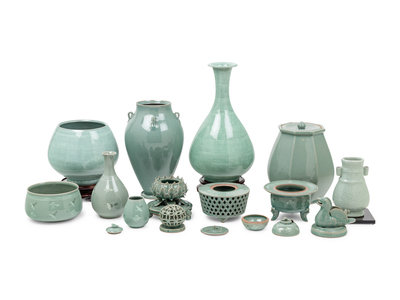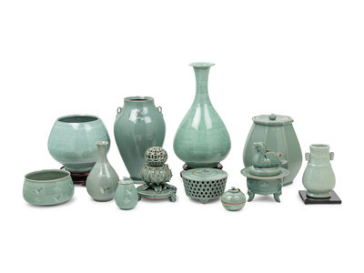 comprising three covered jar, two bowls, four vases and three incense burners, all signed to the underside.