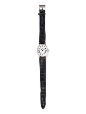 25.00 x 21.00 mm case dimensions, white dial, black Roman numerals, 17 jewel manual wind movement signed Chopard, black leather strap, base metal tang buckle. 5 1/2-6 3/4 inches long.