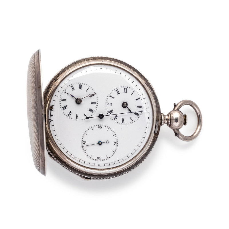 51.00 mm case diameter, white dial, black Arabic and Roman numerals with outer chapter ring calibrated for minutes, two subdials for time at 7 and 11 o'clock, subdial for seconds at 3 o'clock, key wound and set gilt movement, engine turned case.