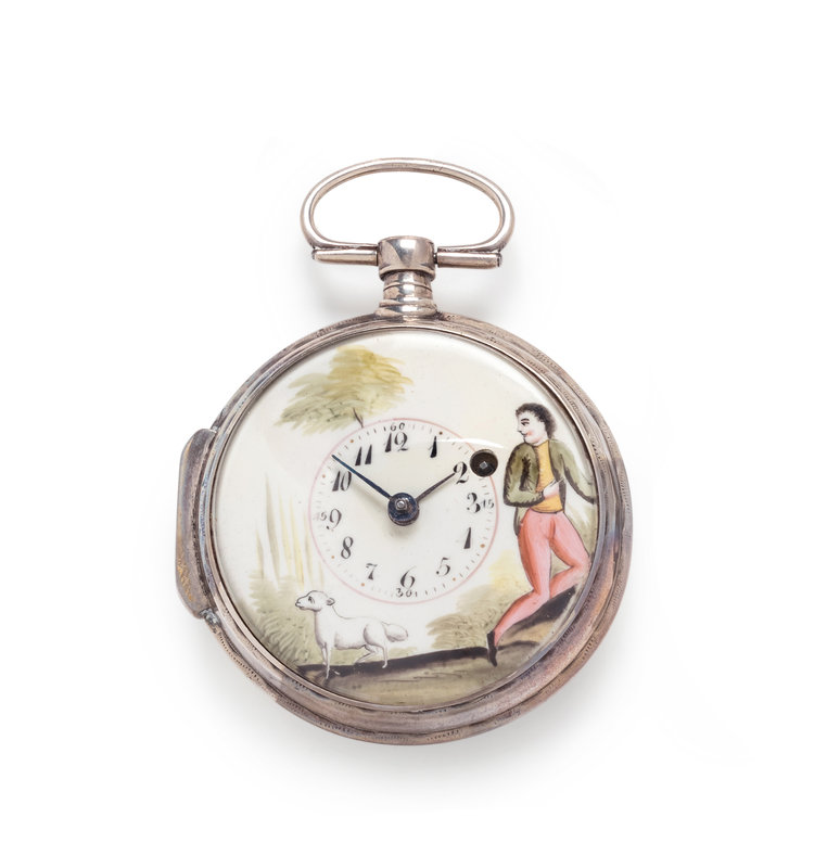 51.00 mm case diameter, off white dial with painted enamel scene with a man and dog, black Arabic numerals with outer chapter ring calibrated for minutes, key wound and set gilt verge fusee movement, exhibition case back.