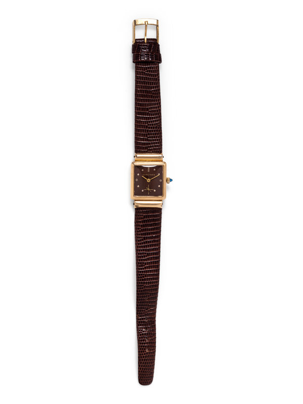 22.00 x 20.00 mm case dimensions exclusive of lugs, brown dial, applied gold dot and bar numerals, subdial for seconds at 6 o'clock, 17 jewel manual wind movement signed LONGINES WATCH Co., brown lizard strap, gold tone tang buckle. 6-7 inches long.