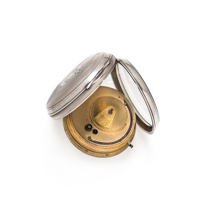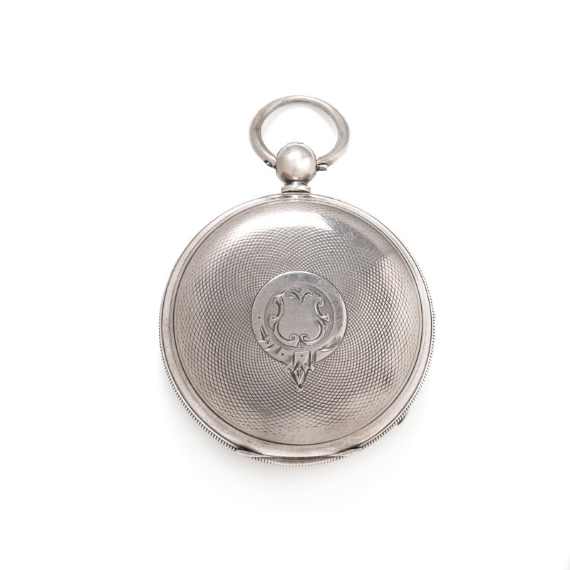 50.00 mm case diameter, white dial, black Roman numerals with outer chapter ring calibrated for minutes, subdial for seconds at 6 o'clock, key wound and set gilt lever fusee movement, engine turned case back with blank cartouche.