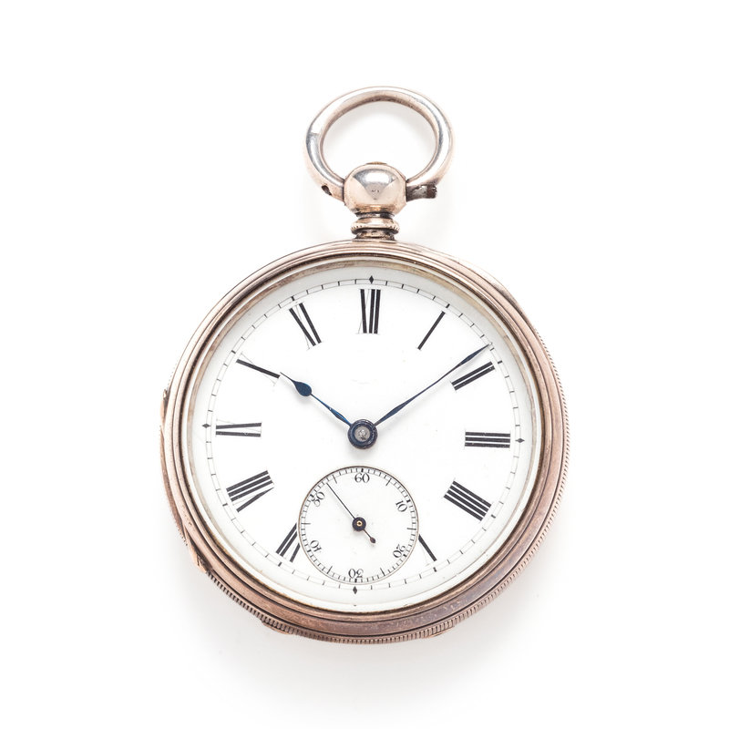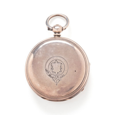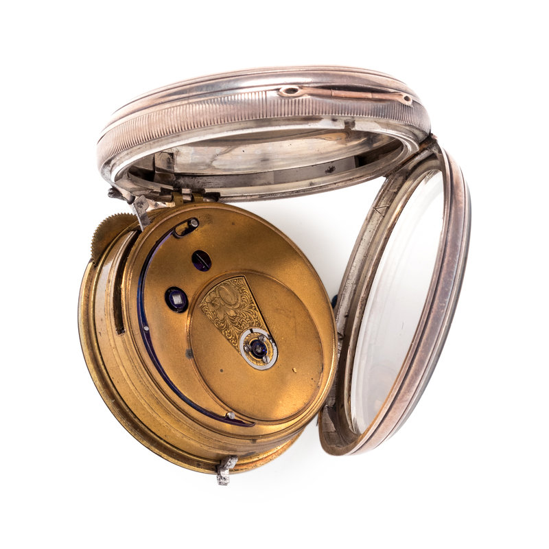 49.00 mm case diameter, white dial, black Roman numerals with outer chapter ring calibrated for minutes, subdial for seconds at 6 o'clock, lever wound gear set gilt verge fusee movement, polished case back with engraved blank cartouche.