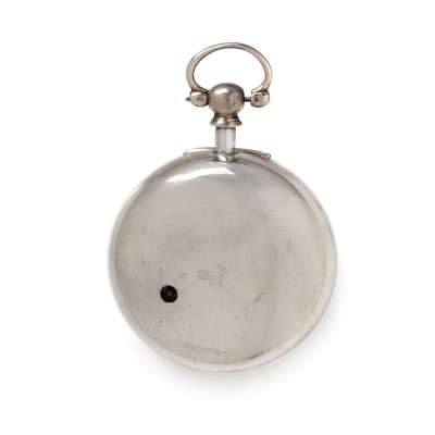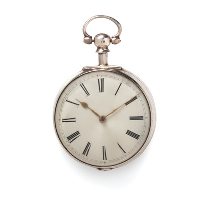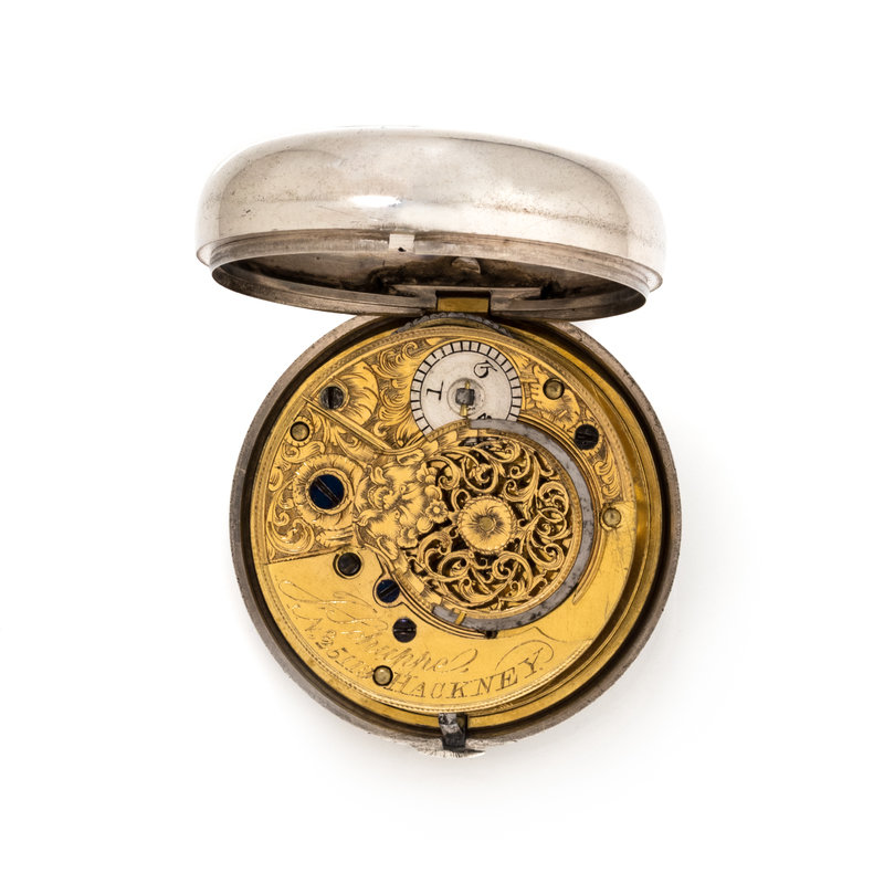54.00 mm case diameter, white dial, black Roman numerals with outer chapter ring calibrated for minutes, key wound and set gilt verge fusee movement signed J. Schuppe HACKNEY, polished case back, with pair case attachment.
