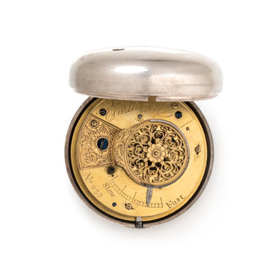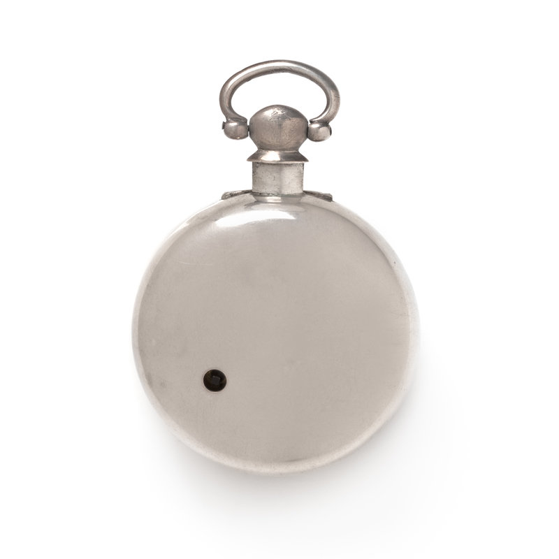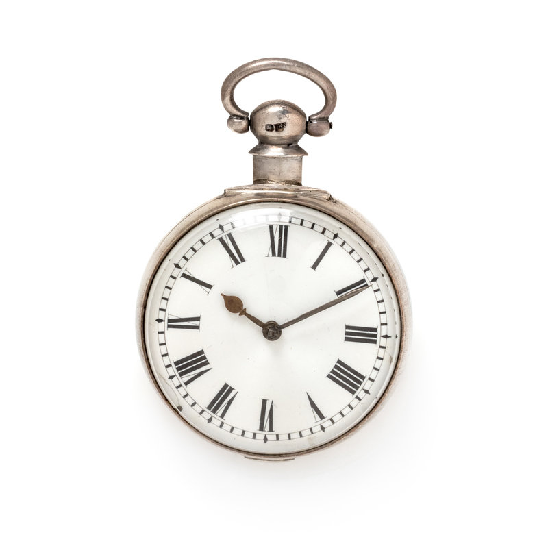 54.00 mm case diameter, white dial, black Roman numerals with outer chapter ring calibrated for minutes, key wound and set gilt verge fusee movement signed L. Thompson Darlington, polished case back, with pair case attachment.