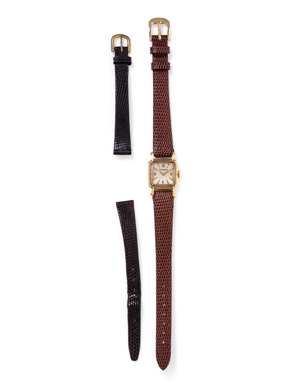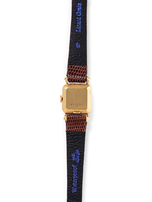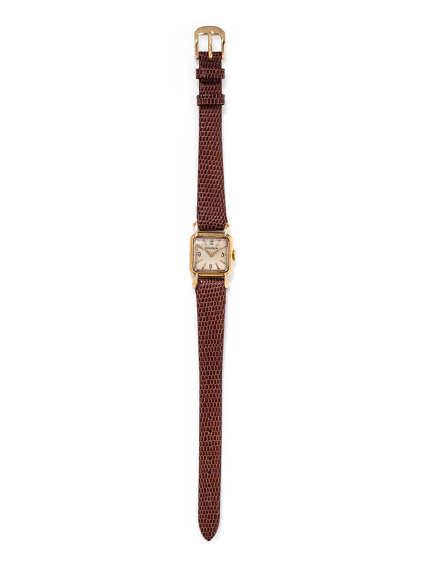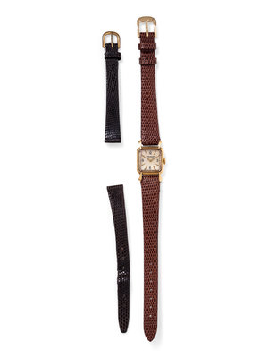 19.00 x 18.00 mm case dimensions exclusive of lugs, matte silvered dial, applied gold dagger and black Arabic numerals, manual wind movement signed JAEGER-LECOULTRE, brown lizard strap, gold tone tang buckle. 6 1/4-7 3/4 inches long.