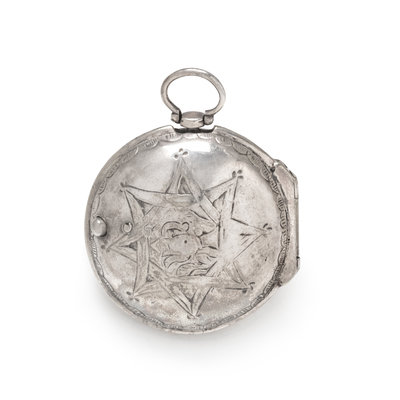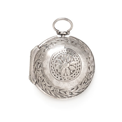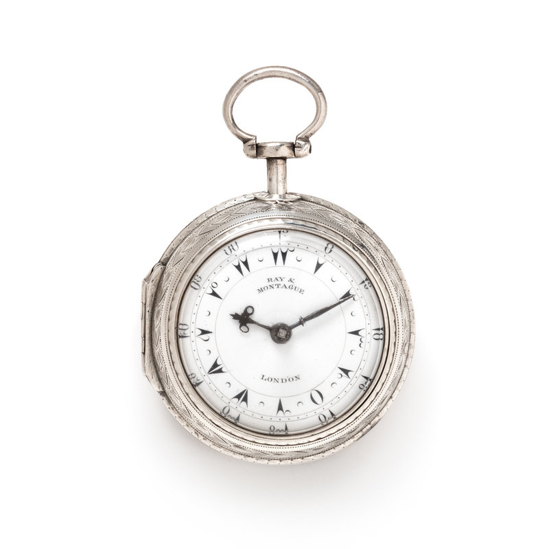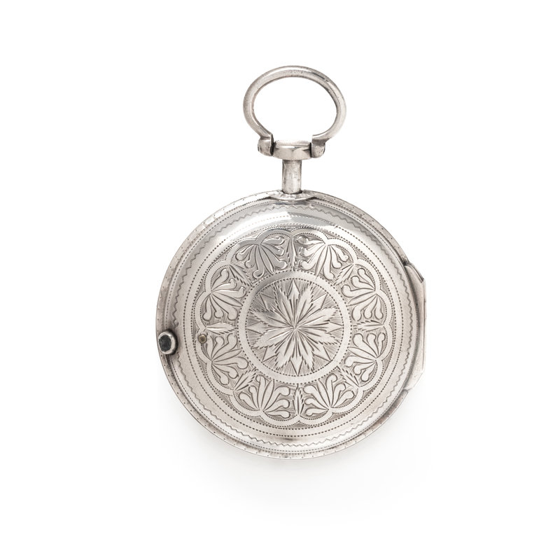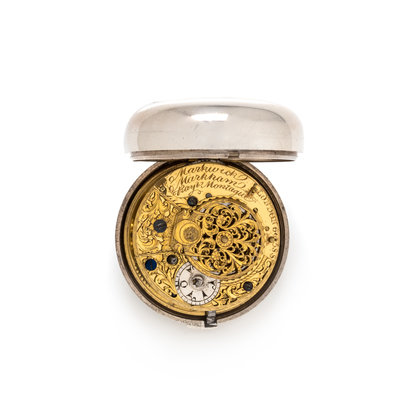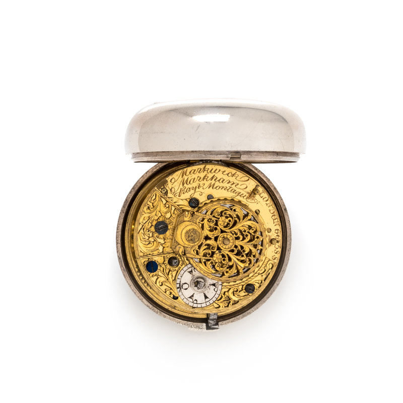 56.00 mm case diameter, white dial, black dagger numerals with outer chapter ring calibrated for minutes, stem wound and set gilt verge fusee movement signed Markwick Markham LONDON, polished case back, with two pair case attachments, one with engraved and one with repousse decoration.