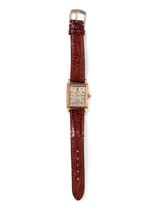 27.00 x 24.00 mm case dimensions exclusive of lugs, matte silvered dial, applied gold pyramid and baton numerals, subdial for seconds at 6 o'clock, 17 jewel manual wind movement signed Omega Watch Co SWISS., brown leather strap, gold tone tang buckle. 6-7 1/2 inches long.