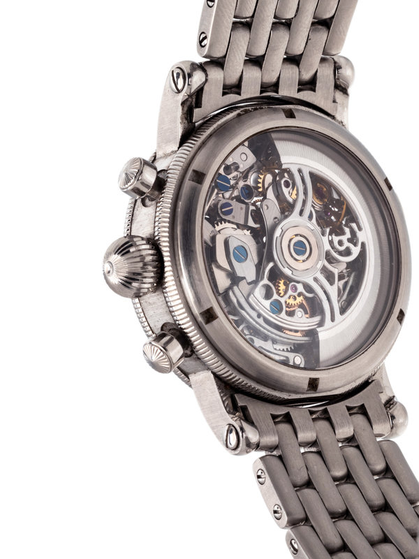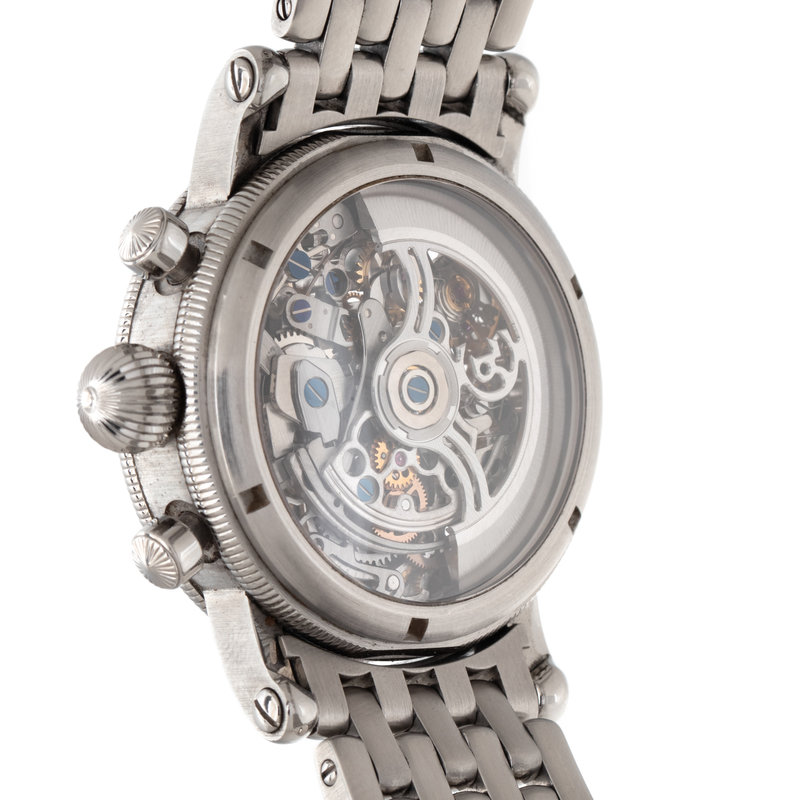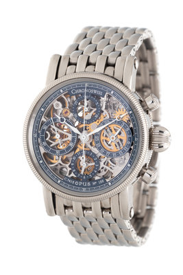 38.00 mm case diameter, blued steel outer chapter ring with steel baton and Arabic numerals, skeletonized dial and case back, subdial for date at 3 o 'clock, 12 hour subdial at 6 o'clock, subdial for seconds at 9 o'clock, 30 second subdial at 12 o'clock, Cal. 741S 23 jewel self-winding movement with chronograph function, the rotor with pierced logo, steel brick link bracelet, double deployant clasp with Chronoswiss logo. 7 inches inner circumference.