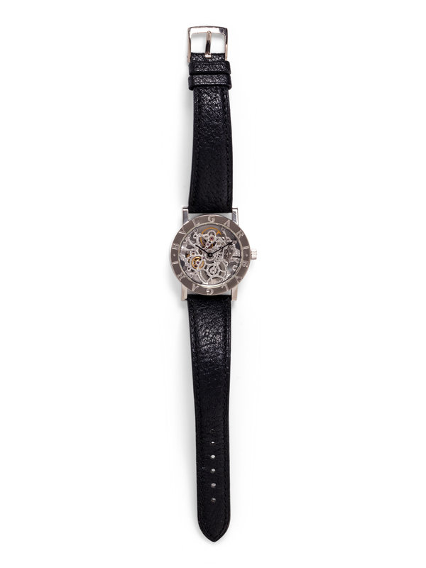 33.00 mm case diameter, skeleton exhibition crystal at front and reverse, bezel signed BVLGARI, self-winding jeweled movement with pierced rotor signed BVLGARI, black leather strap signed BVLGARI, white gold tang buckle. 6 1/2-7 3/4 inches long.