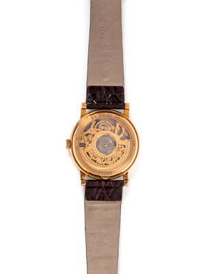 33.00 mm case diameter, skeleton exhibition crystal at front and reverse, bezel signed BVLGARI, self-winding jeweled movement with pierced rotor signed BVLGARI, brown crocodile strap, yellow gold tang buckle. 6-7 3/8 inches long.