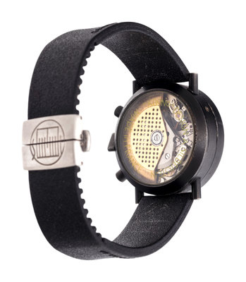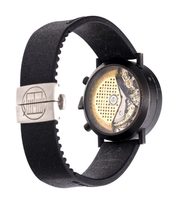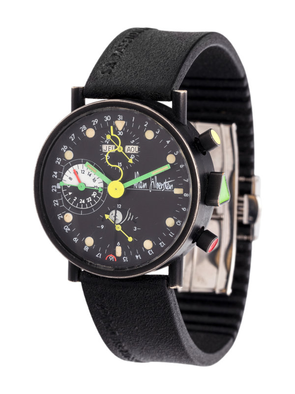 36.00 mm case diameter, black dial, luminous dot and triangular numerals, outer chapter ring to indicate date with white Arabic numerals, subdial for moon phase and month at 6 o'clock, subdial for hours with day/night indicator at 6 o'clock, subdial for seconds at 12 o'clock with day of the week and month apertures, green enamel triangular crown and red and yellow enamel pushers, exhibition case back, Cal. 378 17 jewel self-winding movement with chronograph function, black rubber strap, double deployant steel clasp with logo. 7 1/2 inches inner circumference.