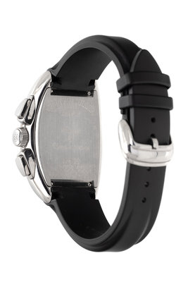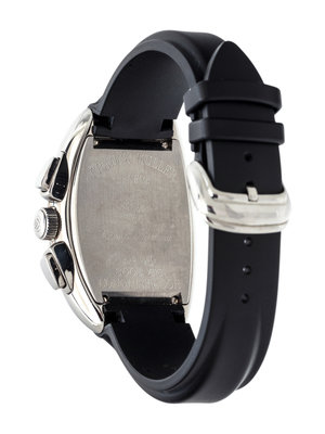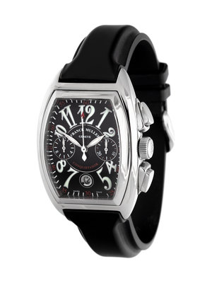 48.00 x 34.00 mm case dimensions inclusive of lugs, black guilloche dial, luminous Arabic numerals, subdials at 3 and 9 o'clock, date aperture at 6 o'clock, center sweep seconds hand, self-winding movement with chronograph function, black rubber strap signed FRANCK MULLER GENEVE, steel tang buckle. 6 1/2-7 3/4 inches long.