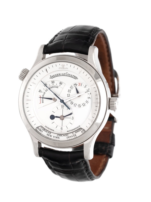 38.00 mm case diameter, matte silvered dial, incline chapter ring with black baton and steel dagger numerals and aperture for world cities, subdial for date at 2 o'clock, 12 hour subdial at 6 o'clock, power reserve indicator between 9 and 11 o'clock, Cal. 21 38 jewel self-winding movement signed JAEGER-LECOULTRE, black leather strap signed JAEGER-LECOULTRE, steel deployant clasp with logo. 6 1/4-7 1/4 inches inner circumference.