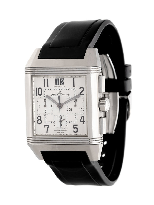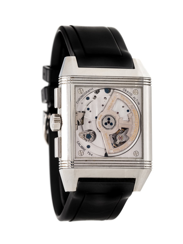 51.00 x 35.00 mm case dimensions inclusive of lugs, two-sided case mounted on a swivel hinge, the face with matte silvered dial, black Arabic numerals, subdial for thirty minute register at 3 o'clock, subdial for 12 hour register at 9 o'clock, 24 hour indication at 6 o'clock, date aperture at 12 o'clock, the reverse with exhibition case back, Cal. 754 39 jewel self-winding movement with chronograph function signed JAEGER-LECOULTRE, black rubber strap signed JAEGER-LECOULTRE, steel Jaeger-LeCoultre double deployant clasp. 6 1/2-8 1/4 inches inner circumference.
