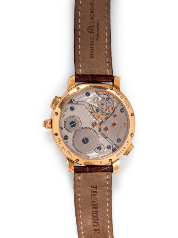 43.00 mm case diameter, matte silvered dial with sunray and grid patterns, applied blued steel geometric and gold dot numerals, 40 hour power reserve at 3 o'clock, retrograde date indicator at 6 o'clock, subdial for seconds at 9 o'clock, retrograde GMT sector at 12 o'clock, exhibition case back, Cal. ML 100 50 jewel manual wind movement signed MAURICE LACROIX, brown crocodile strap signed MAURICE LACROIX, yellow gold tang buckle. 6 3/4-8 inches long.