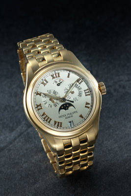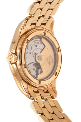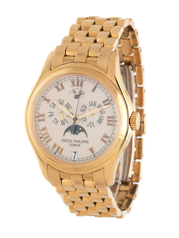 37.00 mm case diameter, off white dial, applied gold Roman numerals, date aperture at 6 o'clock, subdial for month between 2 and 3 o'clock, subdial for moon phase at 6 o'clock, subdial for day of the week between 9 and 10 o'clock, power reserve indicator at 12 o'clock, exhibition case back, Cal. 315/199 37 jewel self-winding movement signed PATEK PHILIPPE, yellow gold rotor with logo, yellow gold brick link bracelet, double deployant clasp with logo. 7 1/4 inches inner circumference.
