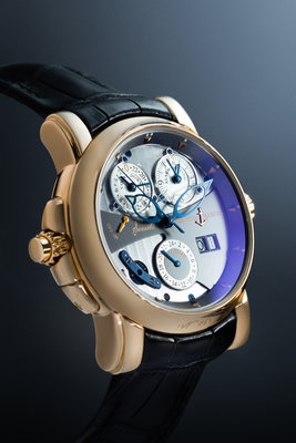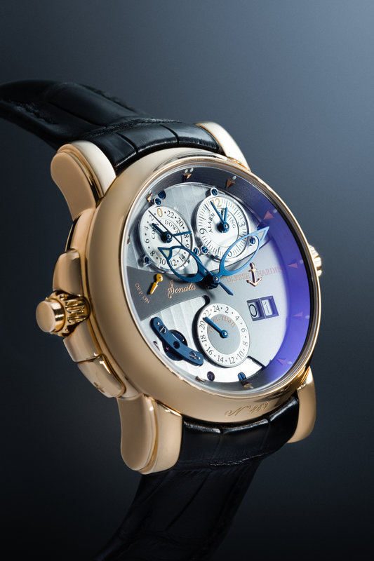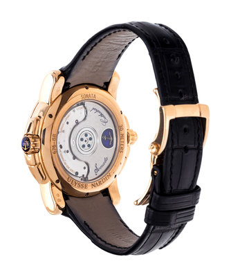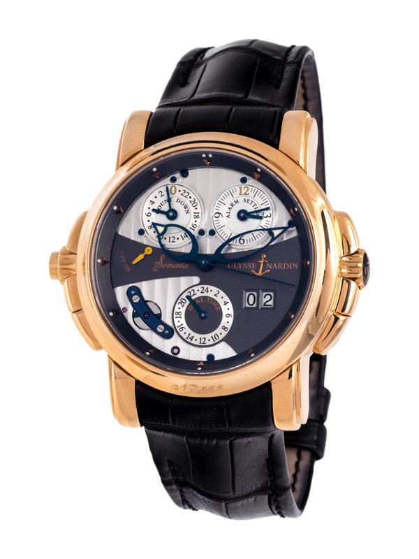 38.00 mm case diameter, silver fausses cotes dial with grayed steel overlay, outer pink gold dart numerals on a grayed incline, date aperture at 4 o'clock, subdial for alarm setting at 1 o'clock, subdial for 24 hour dual time zone at 6 o'clock, blued steel bridge over visible centrifugal governor at 8 o'clock, alarm on/off indicator at 9 o'clock, subdial for 24-hour alarm countdown at 11 o'clock, exhibition case back, Cal. UN067 109 jewel self-winding movement signed Sonata Cathedral, black leather strap signed ULYSSE NARDIN, pink gold folding clasp. 6 1/2-7 3/4 inches long.