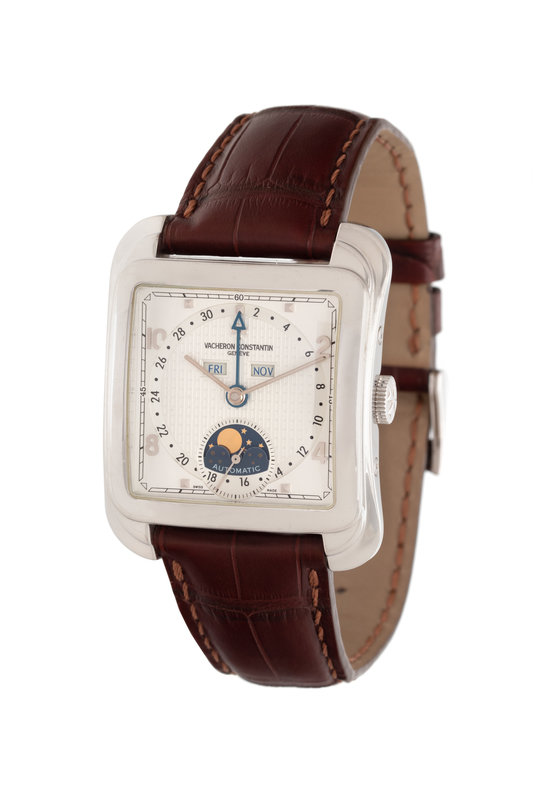 43.00 x 35.00 mm case dimensions inclusive of lugs, matte silvered dial with central fausses cotes decoration, applied white gold pyramid and Arabic numerals, central day of the week and month apertures, outer chapter ring for date, self-winding movement, brown leather strap, white gold tang buckle. 6 3/4-8 inches long.