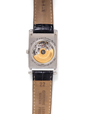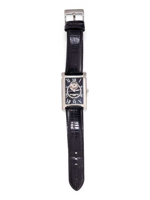 46.00 x 30.00 mm case dimensions inclusive of lugs, black dial with inner guilloche detail, luminous Roman numerals, center sweep seconds hand, date aperture at 6 o'clock, aperture to view the balance and date at 12 o'clock, exhibition case back, 26 jewel self-winding movement signed FREDERIQUE CONSTANT, black leather strap, steel tang buckle. 7 1/2-8 3/4 inches long.