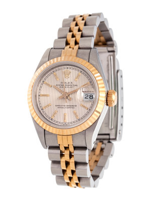 25.00 mm case diameter, fluted champagne dial, applied gold baton numerals, date aperture at 3 o'clock with magnifier in crystal, Cal. 2135 self-winding movement, stainless steel and yellow gold Jubilee link bracelet, deployant clasp with logo. 5 1/4 inches inner circumference.