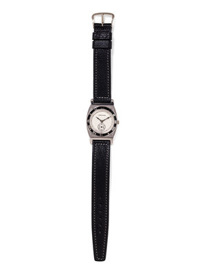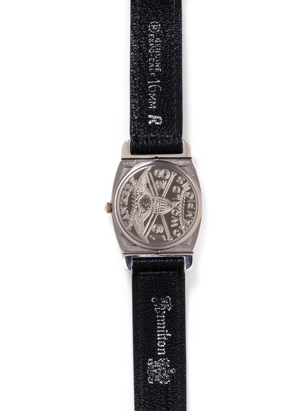 28.00 mm case diameter, matte silvered dial, black enamel bezel with mirror finish Roman numerals, subdial for seconds at 6 o'clock, YANKEES 1928 WORLD CHAMPIONS embossed case back, quartz movement, black leather strap, white gold-filled tang buckle. 6 1/4-7 1/2 inches long.