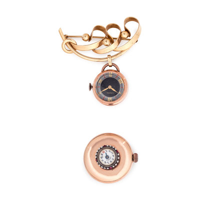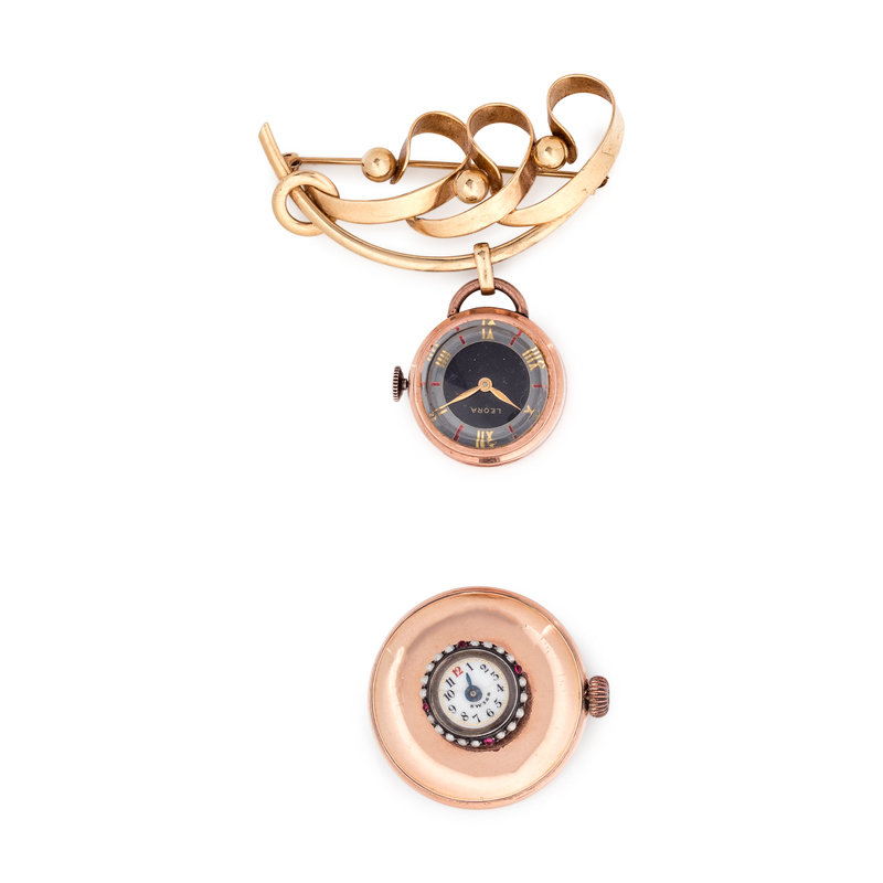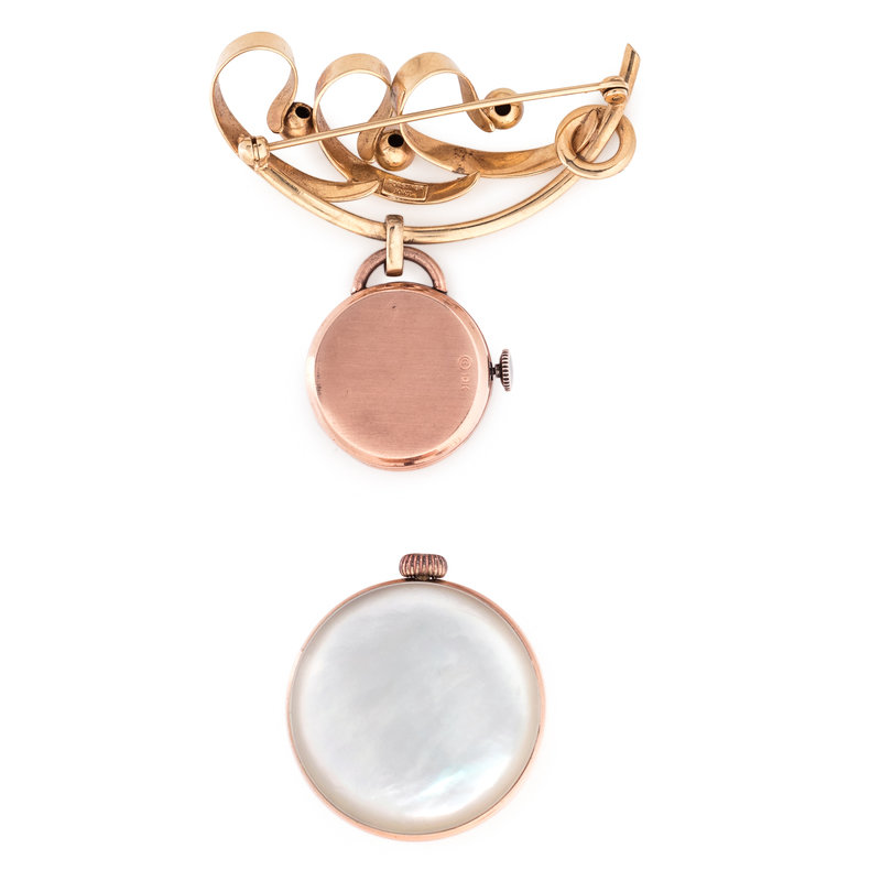 Consisting of a gold-filled mother-of-pearl button watch with 27.00 mm case diameter, white dial, black and red Arabic numerals, the bezel with imitation pearls and paste rhinestones, stem wound and set nickel movement, together with a lapel watch with yellow gold brooch by Forstner suspending a 10 karat gold open face pocket watch with 20.00 mm case diameter, black and blue dial, gold and red Roman and baton numerals, stem wound and set 7 jewel nickel movement signed HELBROS WATCH CO.