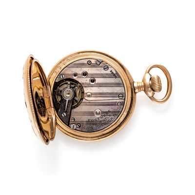 35.00 mm case diameter, white dial, black Roman numerals with outer chapter ring calibrated for minutes, subdial for seconds at 6 o'clock, stem wound lever set 13 jewel nickel movement signed EDGEMERE SWISS SEARS ROEBUCK & Co, yellow, rose and white case with applied and engraved foliate and bird decoration with blank cartouche.