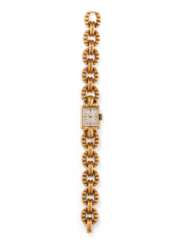 22.00 x 15.00 mm case dimensions, matte silvered dial, applied gold dot and dagger numerals, 17 jewel manual wind movement signed GÜBELIN SWISS, ribbed circular and connector link bracelet, fold over clasp. 6 1/2 inches long.