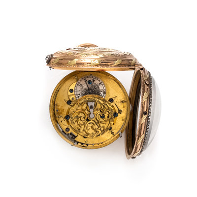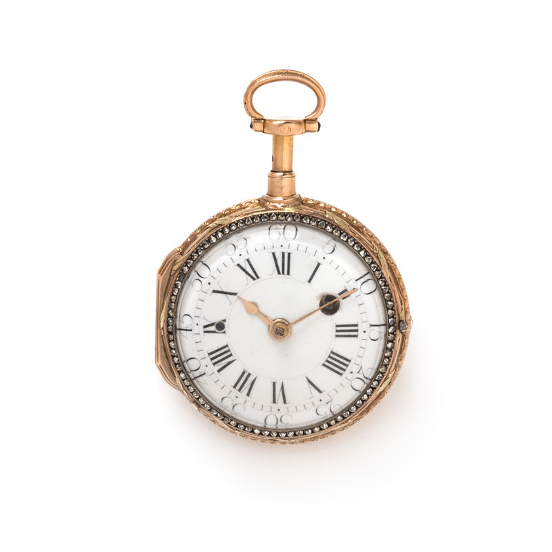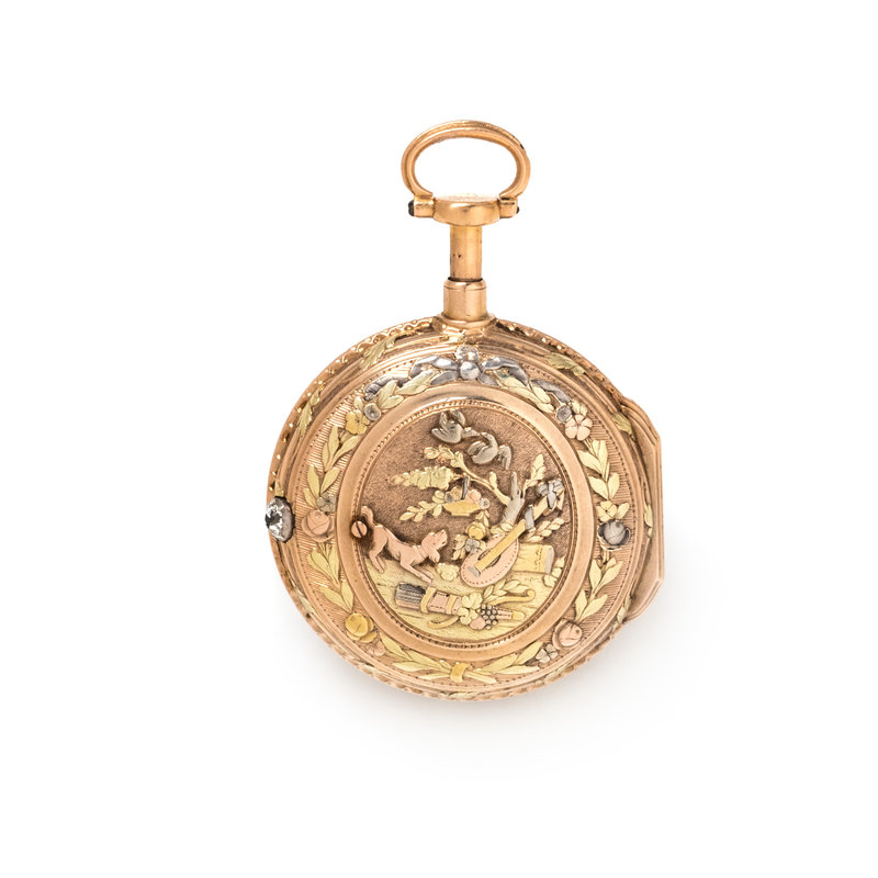 41.00 mm case diameter, white dial, black Roman numerals with outer chapter ring calibrated for minutes, the bezel containing numerous rose cut diamonds, silencer button clasp containing two old mine cut diamonds, key wound and set gilt verge fusee movement with repeater function, case back with applied yellow, white and pink gold floral garland and pastoral scene.
