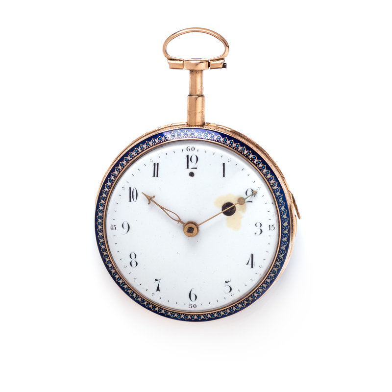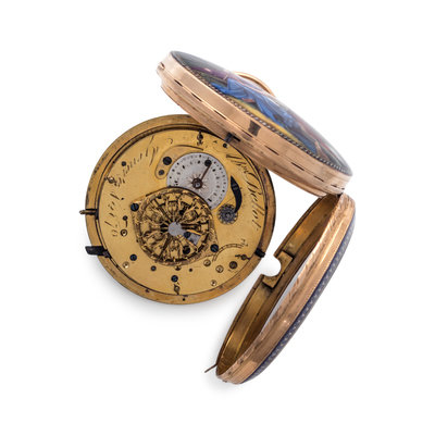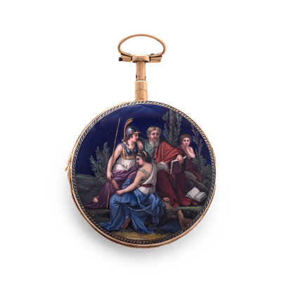 52.00 mm case diameter, white dial, black Arabic numerals with outer chapter ring calibrated for minutes, blue enamel foliate motif bezel, key wound and set gilt verge fusee movement with repeater function signed Mm Bellot Geneve, the case back with painted enamel scene with Classical figures.