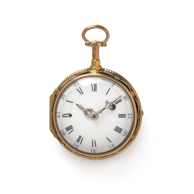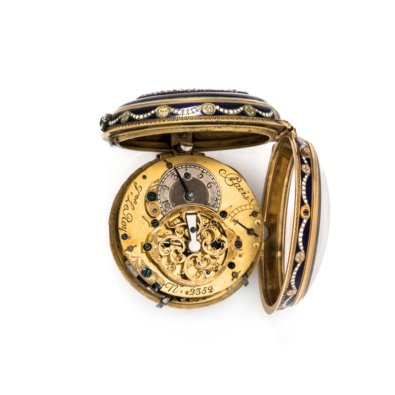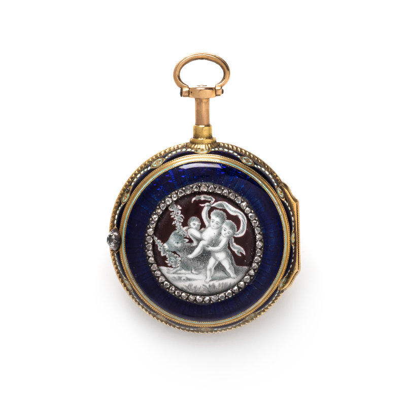42.00 mm case diameter, white dial, black Roman numerals with outer chapter ring calibrated for minutes, key wound and set gilt verge fusee movement with repeater function signed Jen Le Roy Paris, the bezel and case back with blue and white enamel garland motifs, silencer button clasp containing one old mine cut diamond, case back with grisaille enamel painting of three children playing with a goat surrounded by numerous rose cut diamonds,