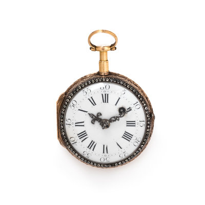 GILT-METAL, PASTE AND ENAMEL OPEN FACE POCKET WATCH
