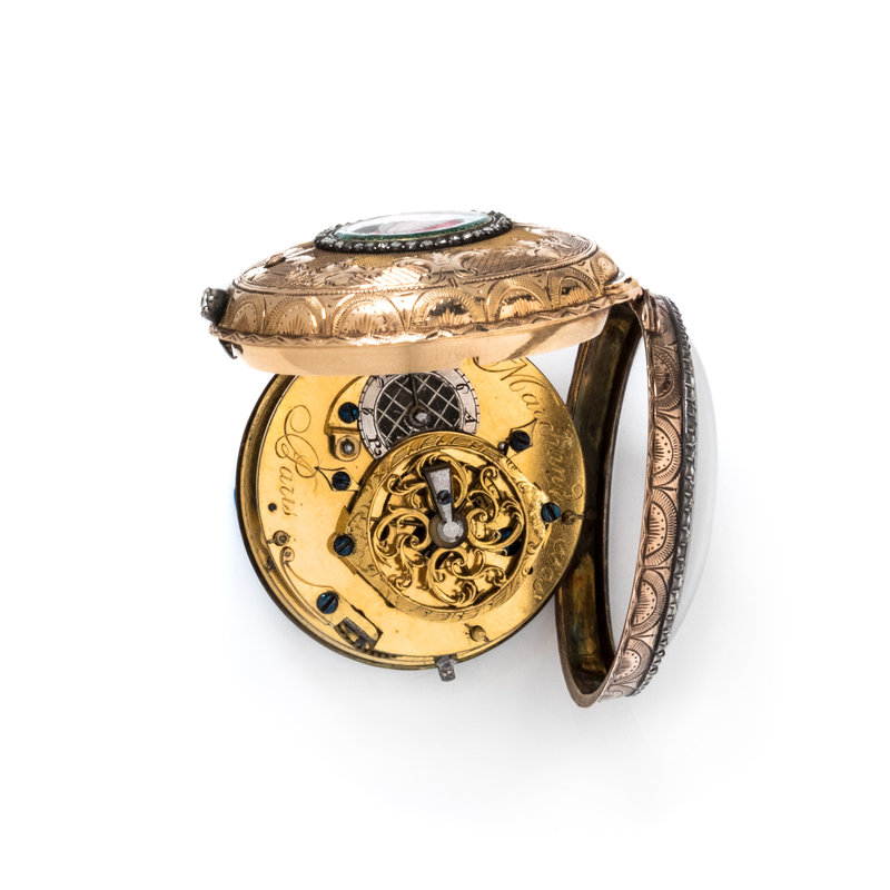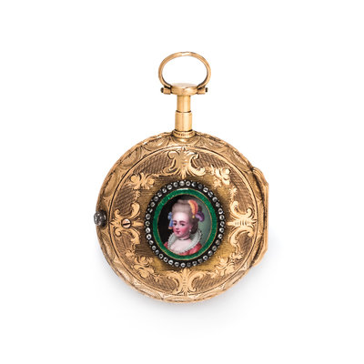 41.00 mm case diameter, white dial, black Roman numerals with outer chapter ring calibrated for minutes, the bezel containing numerous mixed cut paste rhinestones, silencer button clasp containing two rose cut paste rhinestones, key wound and set gilt verge fusee movement signed Marchand Paris, foliate engraved case back with central painted enamel portrait of a woman surrounded by numerous paste rhinestones.