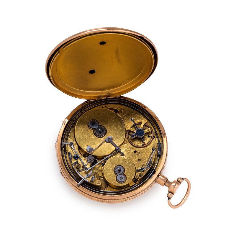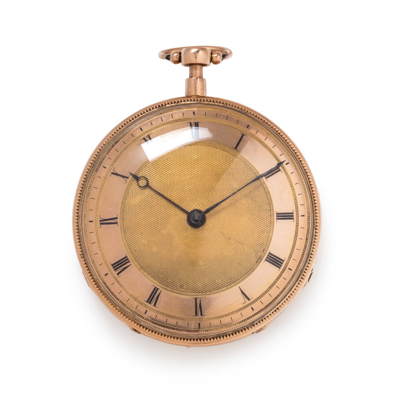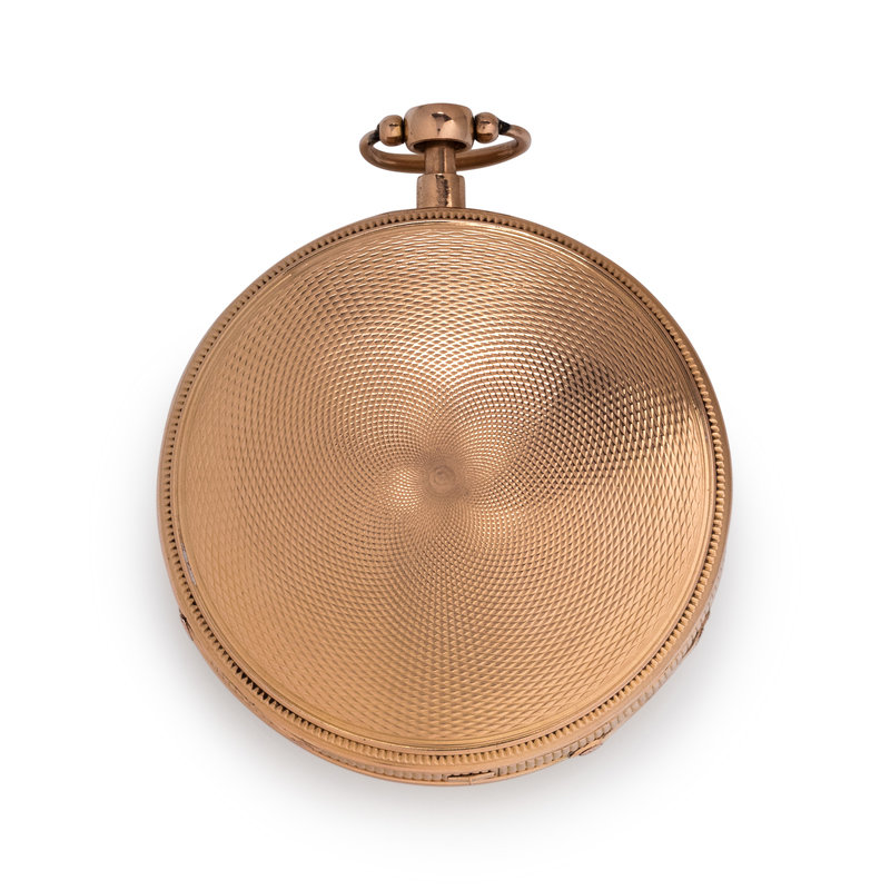 57.00 mm case diameter, geometric guilloche and polished dial, black Roman numerals with outer chapter ring calibrated for minutes, key wound and set gilt fusee movement with musical and repeater functions, engine turned case back.