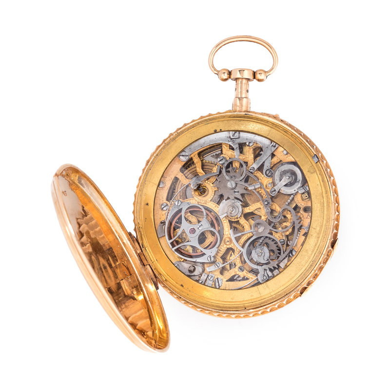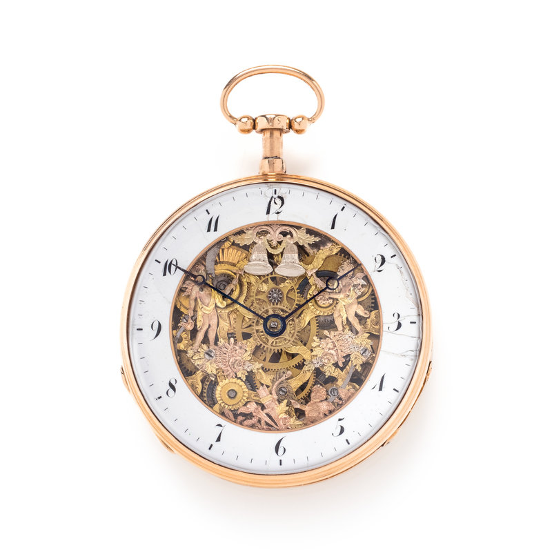 55.00 mm case diameter, white dial with skeletonized center, black Arabic numerals with outer chapter ring calibrated for minutes, coin edge bezel, gilt Cupid and bird decoration and Jacquemart automatons depicted as putti, exhibition cuvette, key wound and set gilt fusee movement with repeater function, engine turned case back with central engraved stylized bird.