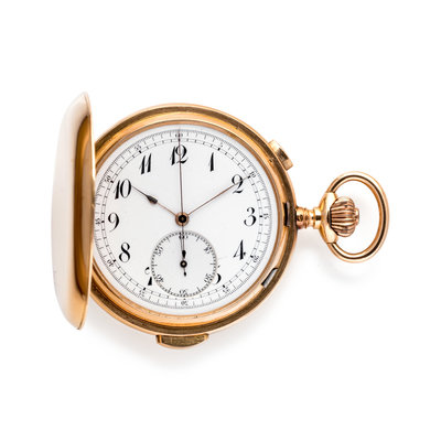 18K YELLOW GOLD QUARTER REPEATER CHRONOGRAPH HUNTER CASE POCKET WATCH