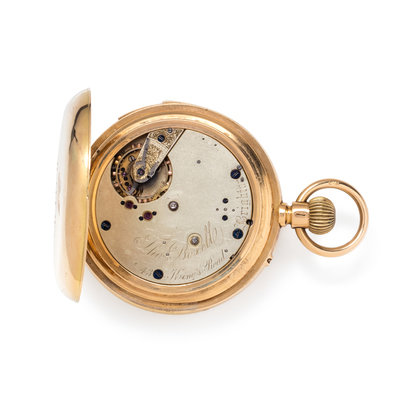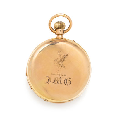 49.00 mm case diameter, white dial, black Roman numerals with outer chapter ring calibrated for minutes, subdial for date at 3 o'clock, subdial for seconds with moon phase at 6 o'clock, subdial for day of the week at 9 o'clock, subdial for months with leap year indication at 12 o'clock, stem wound pusher set jeweled nickel movement with repeater function signed Tho. Boxelle Brighton, monogram and bird engraved case back.