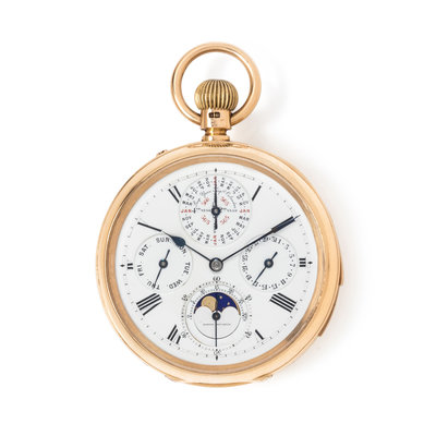 T. BOXELL, 18K YELLOW GOLD PERPETUAL CALENDAR, MOON PHASE, HALF QUARTER HOUR REPEATER OPEN FACE POCKET WATCH