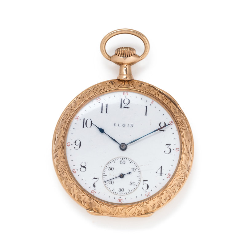 ELGIN, 14K YELLOW GOLD OPEN FACE POCKET WATCH WITH GOLD-FILLED FOB CHAIN