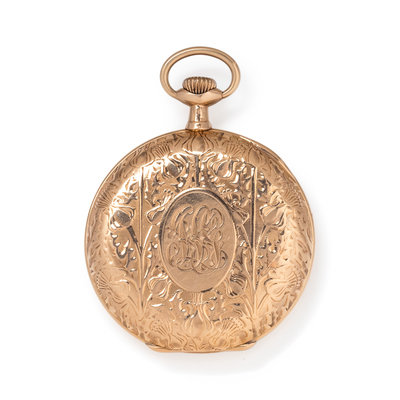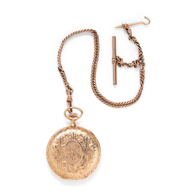 47.00 mm case diameter, white dial, black Arabic numerals with outer chapter ring calibrated for minutes, subdial for seconds at 6 o'clock, stem wound and set 17 jewel nickel movement signed Elgin Nat'l Watch Co. U.S.A., foliate motif chased and engraved bezel and case back with monogram engraved cartouche, together with a gold-filled curb link fob chain.