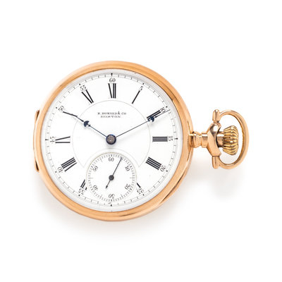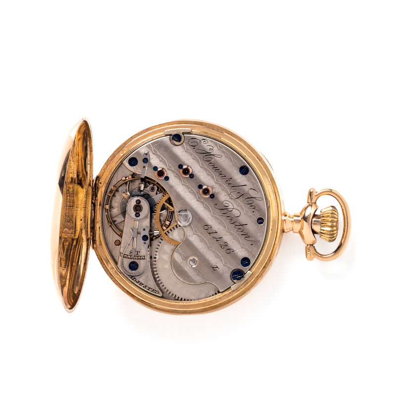 47.00 mm case diameter, white dial, black Roman numerals with outer chapter ring calibrated for minutes, subdial for seconds at 6 o'clock, stem wound and set nickel movement signed E. Howard & Co. Boston, monogram engraved case back.