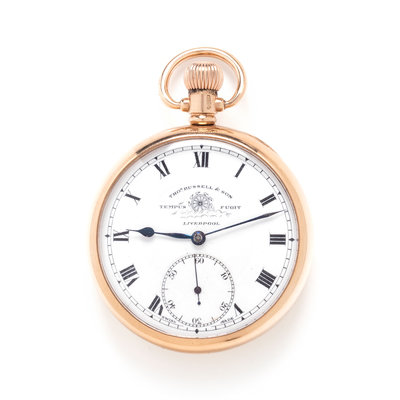 47.00 mm case diameter, white dial, black Roman numerals with outer chapter ring calibrated for minutes, subdial for seconds at 6 o'clock, stem wound and set 10 jewel nickel movement signed THOS RUSSELL & SON LIVERPOOL SWISS MADE,