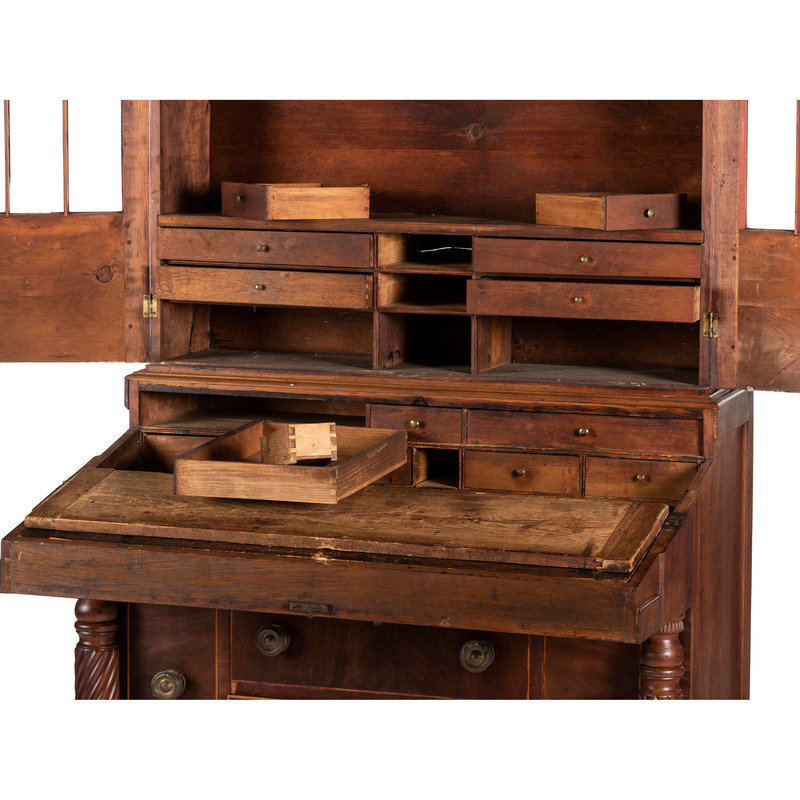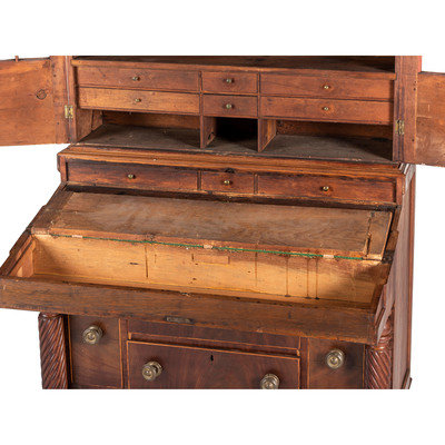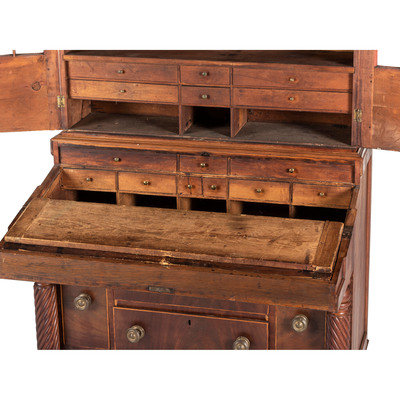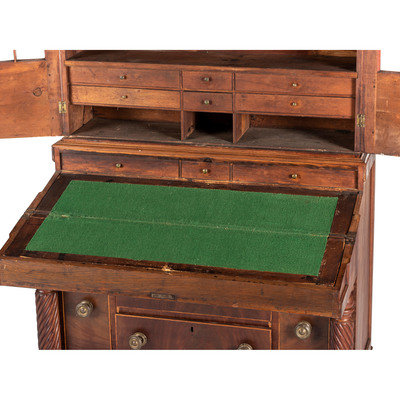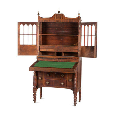 A Classical Figured Maple and Mahogany Desk-and-Bookcase