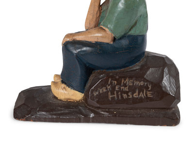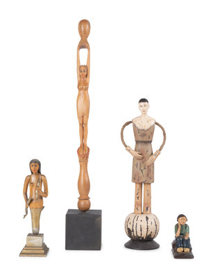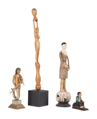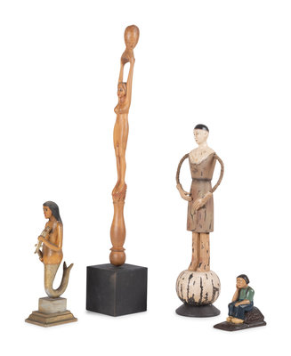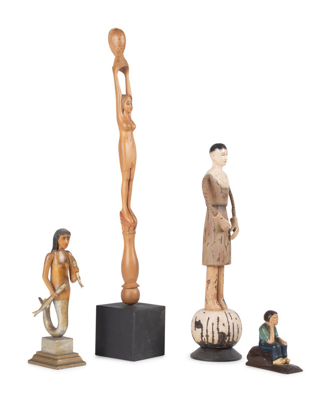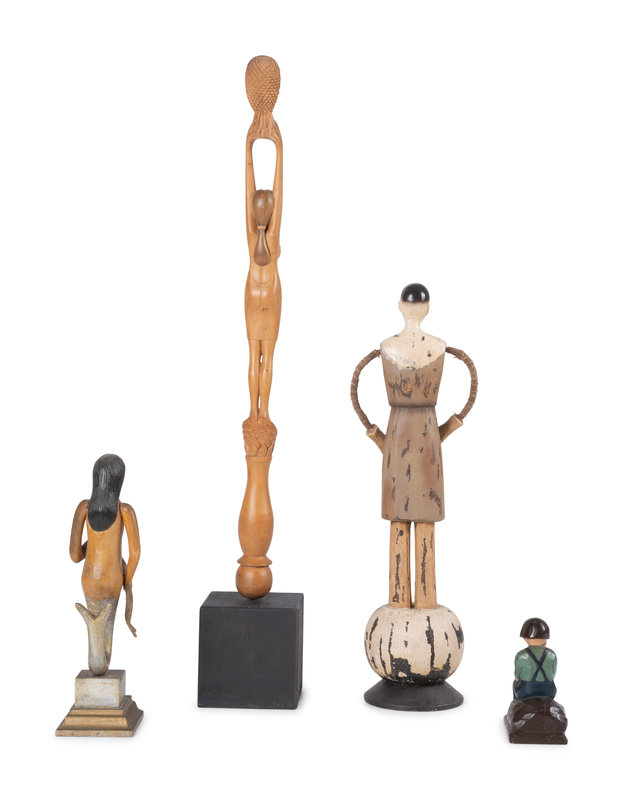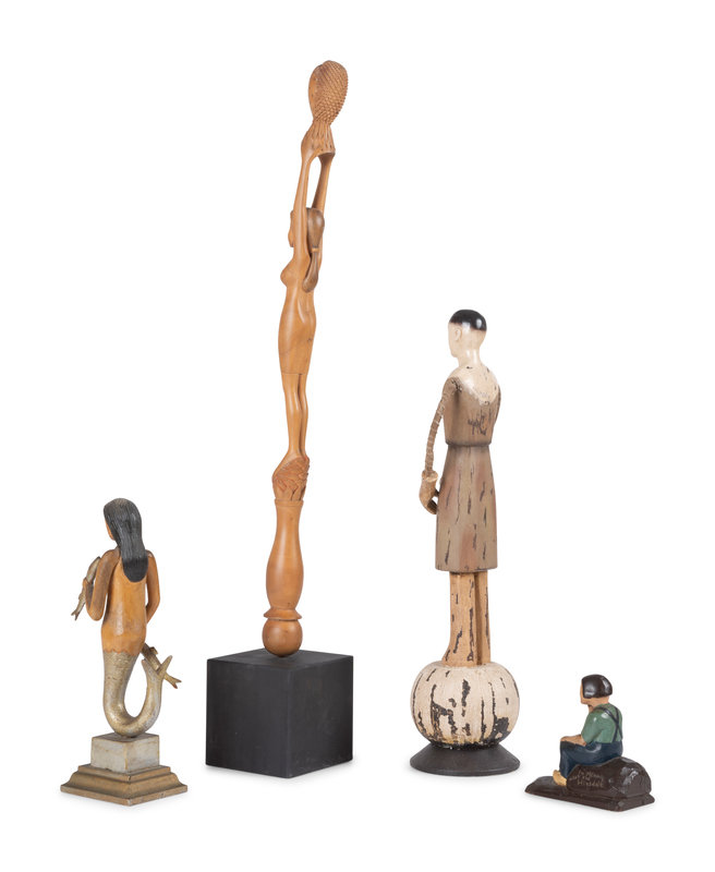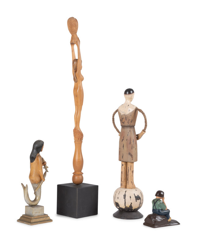 Comprising a figural pointer, signed Benzrosky; a mermaid figure holding fish, signed M. Rothli… 1920; a seated thinker incised In Memory Week End Hinsdale; and a figure of an acrobat.